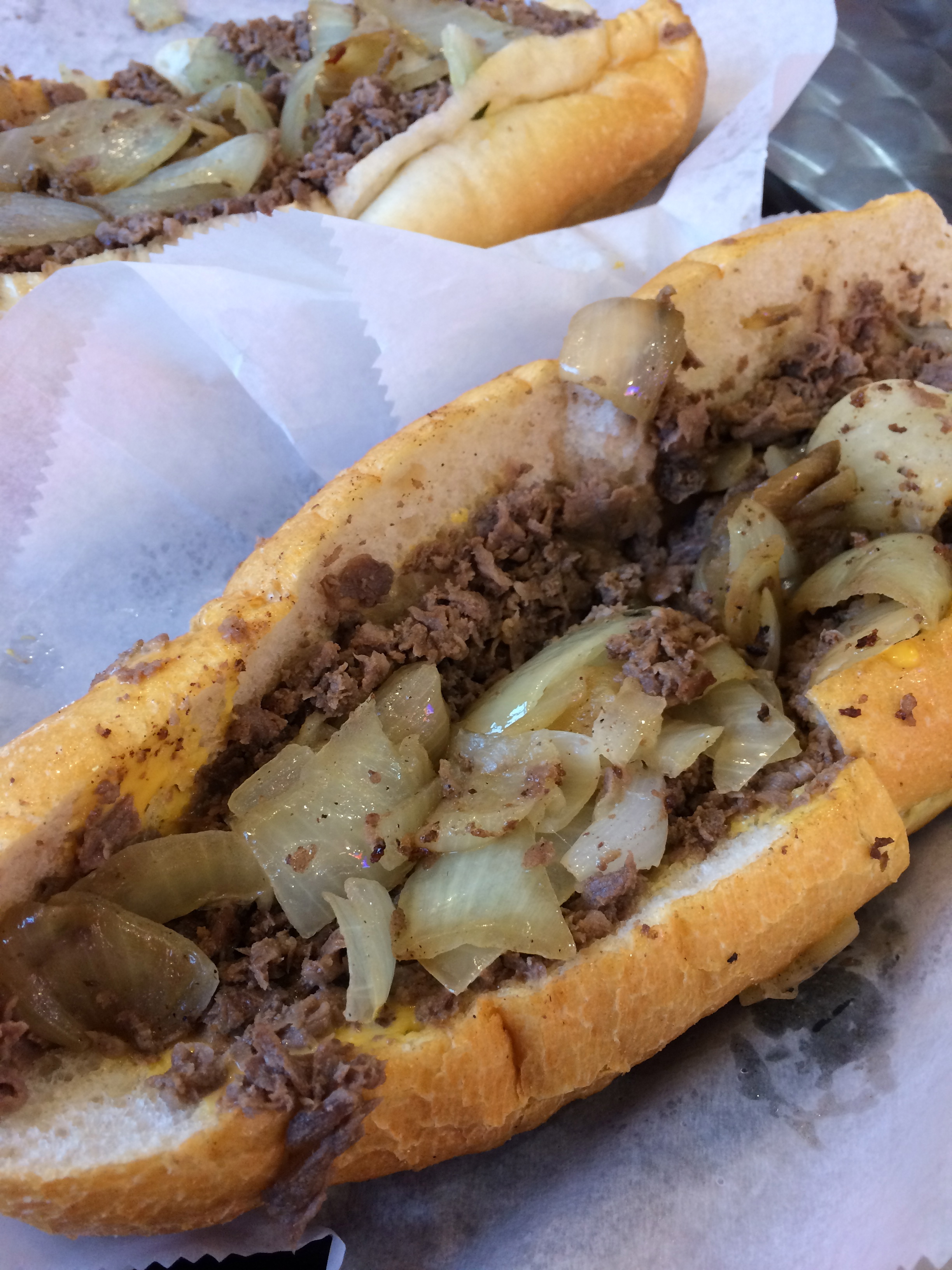 The line for Jim’s Steaks on South Street was out the door when I arrived, but not quite around the corner yet. It moved relatively quickly, although the incredible meaty smells you’re ambushed with as soon as you pass through the doorway make it difficult to wait at all. You place your order directly with the guys behind the grill, and in true Phila style, I went with “one wiz wit” (one steak sandwich with cheese whiz and onions). These guys, of course, have the sandwich making process down to a science, slathering the cheese whiz (or provolone, depending upon which you chose), onto the bread, passing it over to the next guy who puts the bread face down over the perfectly cooked steak, and scoops it all up with a flat spatula, before topping the sandwich off with some fried onions.