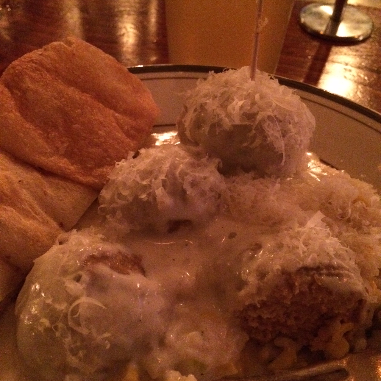 Now for the food order: Typically I go with the classic beef balls and spicy meat sauce over a nice layer of polenta. But this time, I decided to switch it up—a lot. After a quick consultation with the bartender on recommendations and specials, I decided to go with the spicy pork balls (his favorite), over the risotto special of the day—corn, leek, and chives (I can never really say no to anything with corn)—and then topped off with their Parmesan cream sauce (another recommendation). Wow. And now I can’t actually stop thinking about this meatball combination and wanting it again. I’m sure I’ll be back again soon—and next time, I’ll hopefully save room for the ice cream sandwich dessert!