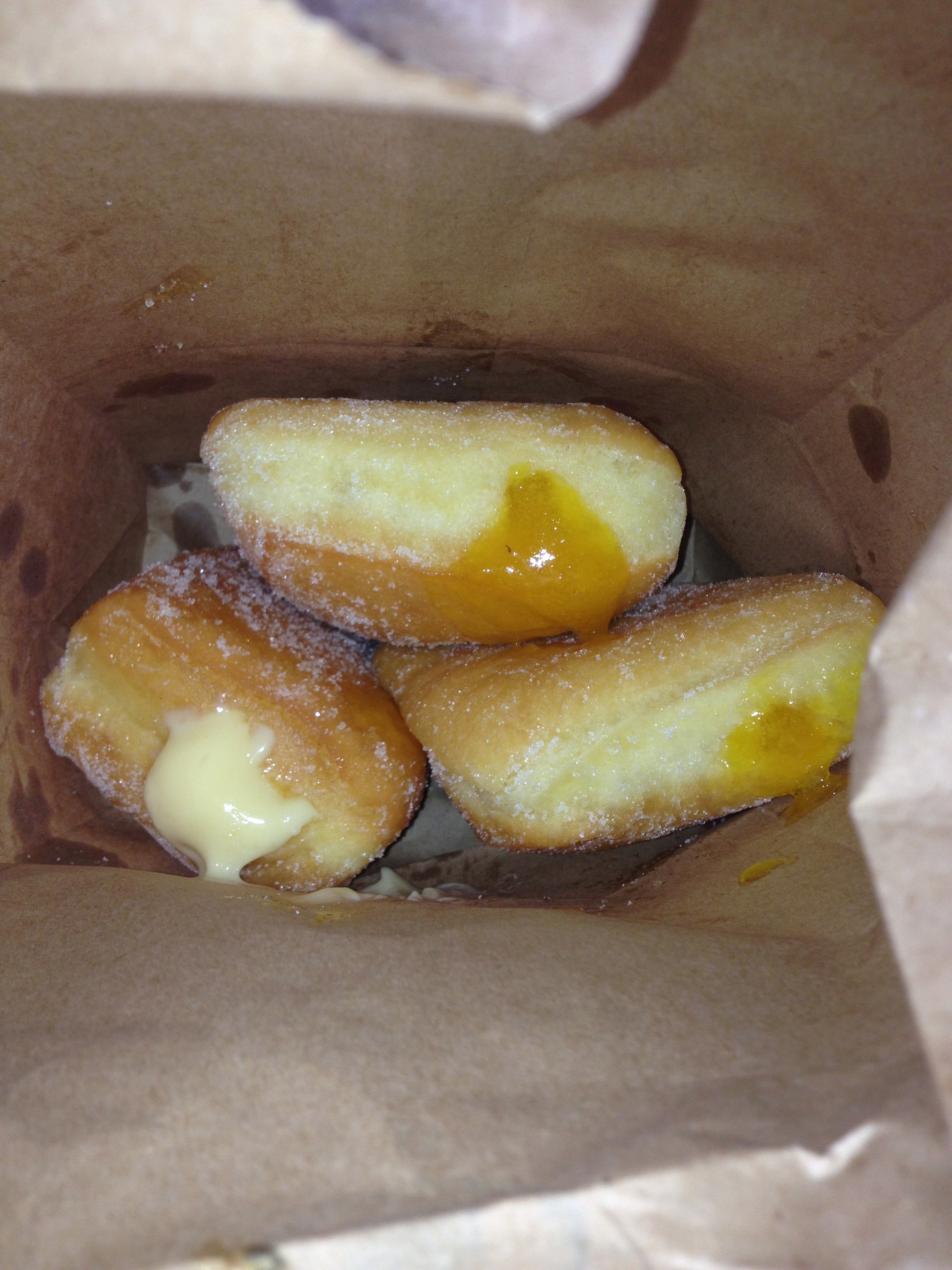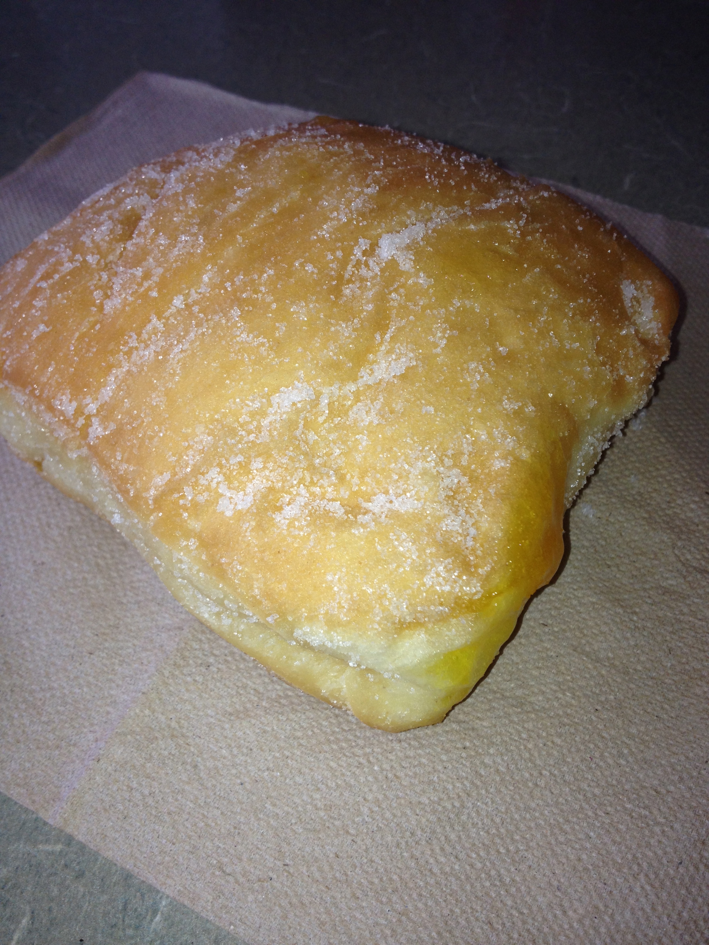 Once inside the restaurant, you order from a window and then choose a table to sit at while you wait for your food to be prepared. I think the obvious choice on the menu is to go with the Hawaiian Burger—meat with pineapple, lettuce, tomato, and Thousand Island dressing. How can you go wrong? When you unwrap the burger from the white paper, you’ll soon find out this easy lunch is all sorts of delicious. Although nothing fancy, this simple burger carries the essence of Hawaii with the trademark pineapple ring nestled underneath a meat patty inside a slightly sweet, soft bun. The meat is cooked perfectly and satisfies you without making you feel stuffed, which is important because you can’t leave Tex without also getting a malasada.